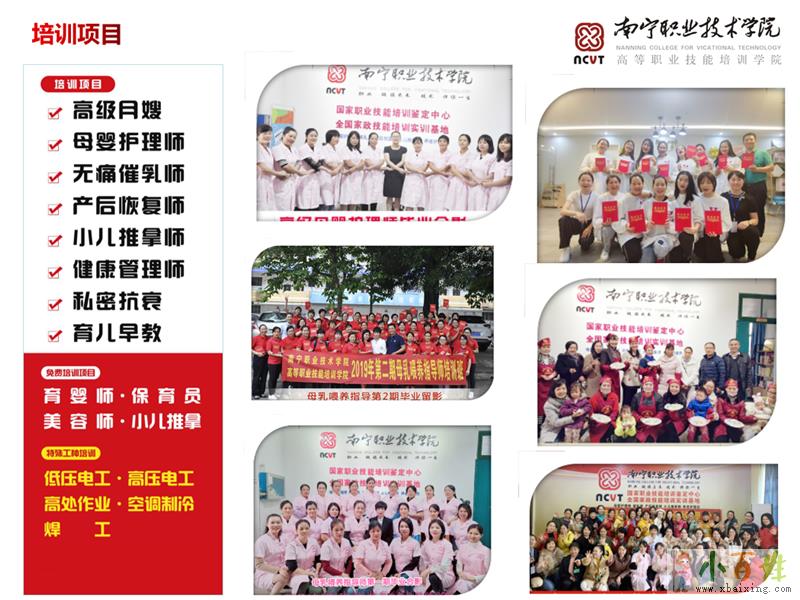 南宁职业技术学院高等职业技能培训学院,是广西规模较大的设备齐全,师资专业的家政人才培训基地学校常年开设有:高级月嫂,高级小儿推拿师,高级催乳师,高级产后修复师,艾灸经络师,高级育婴师,脐灸 一指私密健康管理师,育儿早教师养生推拿等专业培训课程